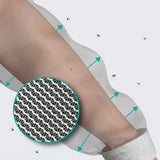 We use a very fine mesh fabric (noseeum grade) that keeps insects from being able to fly or crawl through the holes of the fabric. It uses the pocket of air between your skin and the fabric to create a natural barrier to keep insects away from your skin. It is insecticide-free and offers another layer of protection against mosquitoes, ticks, noseeums, black flies and more. It can be used on its own or in combination with more traditional mosquito repellents.